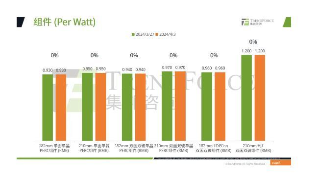 182mm单面单晶PERC组件价格为RMB0.93/W;210mm单面单晶PERC组件报价为RMB0.95/W;182mm双面双玻单晶PERC组件报价为RMB0.94/W;210mm双面双玻单晶PERC组件价格为RMB0.97/W。182mmTOPCon双面双玻组件报价为RMB0.96/W,210mmHJT双面双玻组件价格为RMB1.2/W。