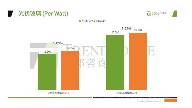 2.0mm镀膜光伏板玻璃价格上涨至RMB18/㎡,3.2mm镀膜光伏板玻璃人民币为RMB26.5/㎡;涨幅分别为9.09%和3.92%。