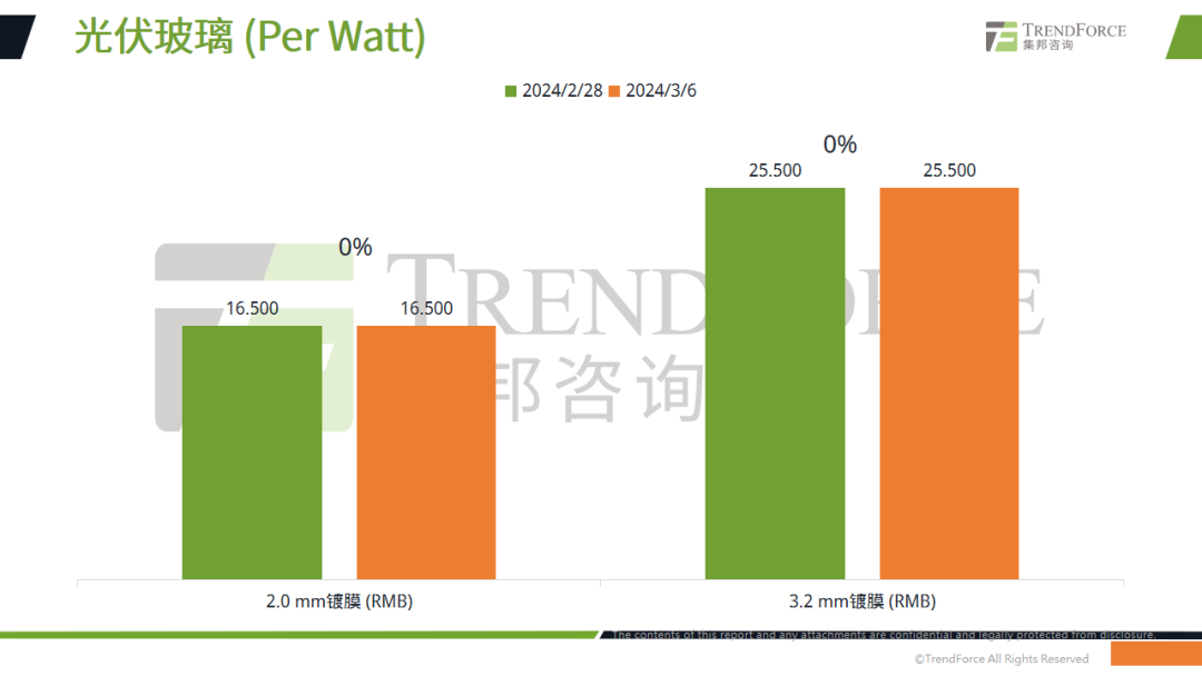 2.0mm镀膜光伏板玻璃价格维RMB16.5/㎡;3.2mm镀膜光伏板玻璃人民币为RMB25.5/㎡。