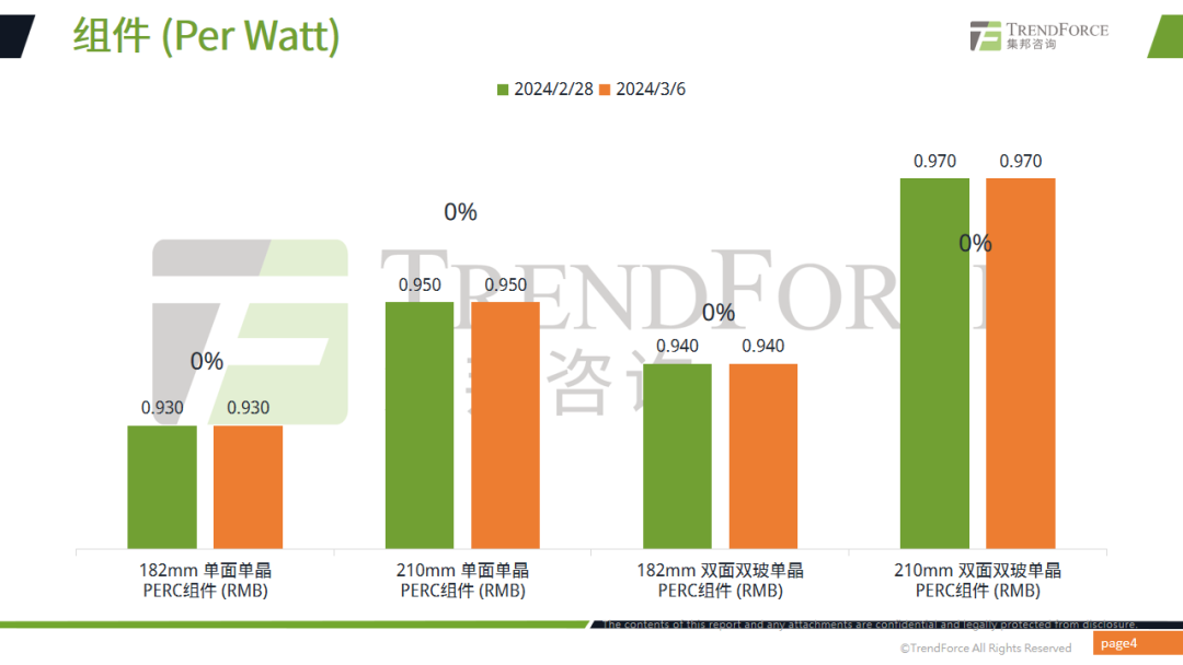 182mm单面单晶PERC组件价格为RMB0.93/W;210mm单面单晶PERC组件报价为RMB0.95/W;182mm双面双玻单晶PERC组件报价为RMB0.94/W;210mm双面双玻单晶PERC组件价格为RMB0.97/W。