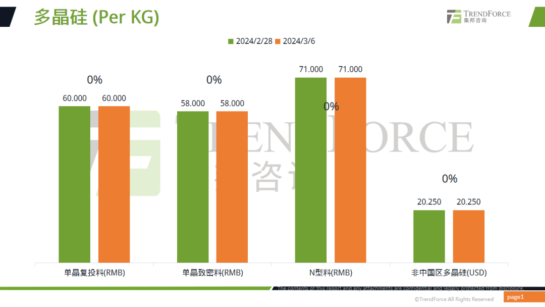 根据TrendForce集邦咨询旗下新能源研究中心2023年3月6日的报价,单晶复投料人民币价格为RMB60/KG;单晶致密料人民币最新价格为RMB58/KG。N型料人民币报价企稳在RMB71/KG。非中国区多晶硅料美金价格为US$20.25/KG。