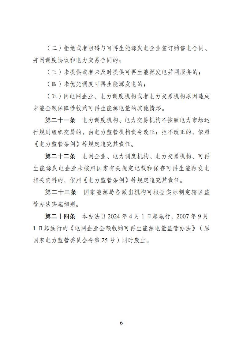 3月18日,中华人民共和国国家发展和改革委员会令第15号发布。《全额保障性收购可再生能源电量监管办法》已经2024年2月5日第9次委务会议审议通过,现予公布,自2024年4月1日起施行。