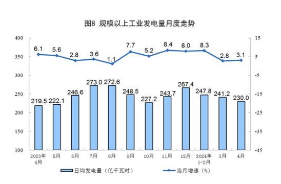 电力生产增速有所加快。4月份,规上工业发电量6901亿千瓦时,同比增长3.1%,增速比3月份加快0.3个百分点;日均发电230.0亿千瓦时。1—4月份,规上工业发电量29329亿千瓦时,同比增长6.1%。