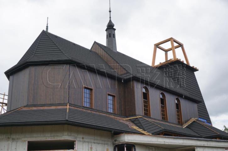 彩石金属瓦广泛应用于星级酒店建筑、私人住宅建筑、别墅建筑、学校建筑、办公楼建筑等屋面装饰工程,同时也适用于旧顶翻新、厂房改造、平改坡等各项大型工程。由于其轻质、立体感好、颜色丰富、抗风性强等特点,使得彩石金属瓦成为国家新型建筑节能环保材料的代表之一。