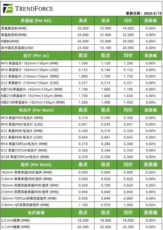 根据TrendForce集邦咨询新能源研究中心6月19日最新报价,本周各环节价格继续持稳。单晶复投料主流成交价格为34元/KG,单晶致密料的主流成交价格为32元/KG,N型料报价38元/KG。