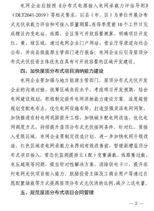 电网企业要加强与地方能源主管部门、屋顶分布式光伏开发企业的沟通对接,统筹区域负荷水平,考虑项目开发预期,结合电网建设规划,积极制定提升电网消纳能力建设方案。适度超前规划变配电布点,优化电网设施布局,打造坚强灵活电网网架,加快推进农村电网巩固提升工程,加快城乡配电网改造,优化电网调度方式,持续提升屋顶分布式光伏接网条件。针对红、黄接入受限区域,电网企业要制定改造计划,进一步加快电网升级改造,红色区域在电网承载力未得到有效改善前,暂缓新增屋顶分布式项目接入。常态化监测摸排主(配)变重满载、线路重过载、电压越限等问题,提出针对性解决方案,消除供电卡口,提升农村电网光伏项目接入能力。鼓励投资主体及工商业用户等通过自愿配置储能等方式提高屋顶分布式光伏消纳比例、减少上送电量。
