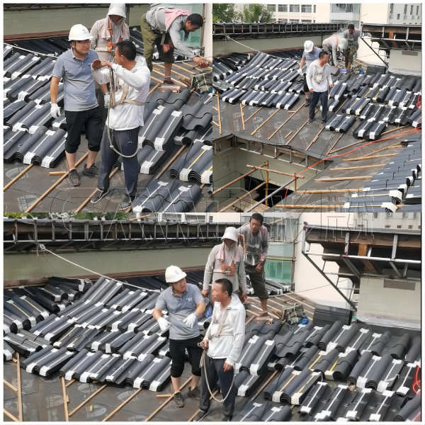 翻新工作最初,专业团队首先对故居的屋面进行了细致的勘察与测量,确保每一片新瓦都能精准对接,不破坏原有的建筑结构。随后,彩麟生产的仿古瓦被小心翼翼地铺设上去。安装过程中,工匠们展现了高超的技艺,他们按照正确的铺设手法,确保每片瓦之间紧密衔接,既美观又牢固。同时,他们还特别注意瓦片的排列和搭接,以保证屋面的整体效果和防水性能。