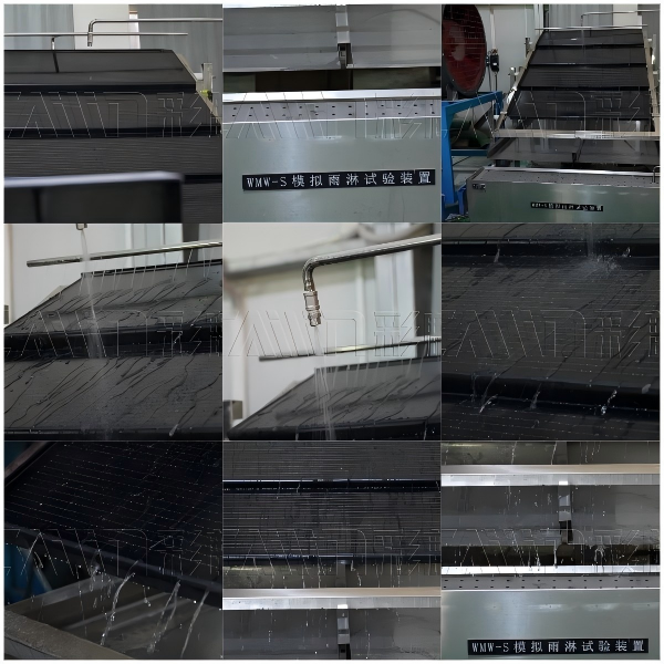 为了验证彩麟光伏瓦的防水性能,实验室还进行了模拟雨淋测试。通过高精度的喷水装置,模拟了长时间、高强度的降雨场景,观察瓦片表面的排水效率及背面是否有渗漏现象。测试结束后,检查发现彩麟光伏瓦表面排水顺畅,瓦片间密封性良好,无任何水滴渗透至瓦片背面,这得益于其先进的防水设计和优质的密封材料,确保了光伏瓦在雨季也能保持高效发电,同时保护建筑内部不受雨水侵袭。