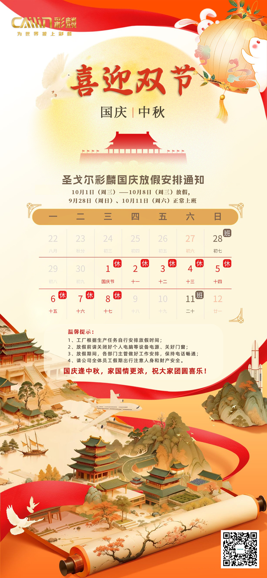根据国务院发布的2025年法定节假日安排,结合我司实际情况,2025年双节放假具体通知如下,客户朋友们不要跑空,下单提前安排哦~